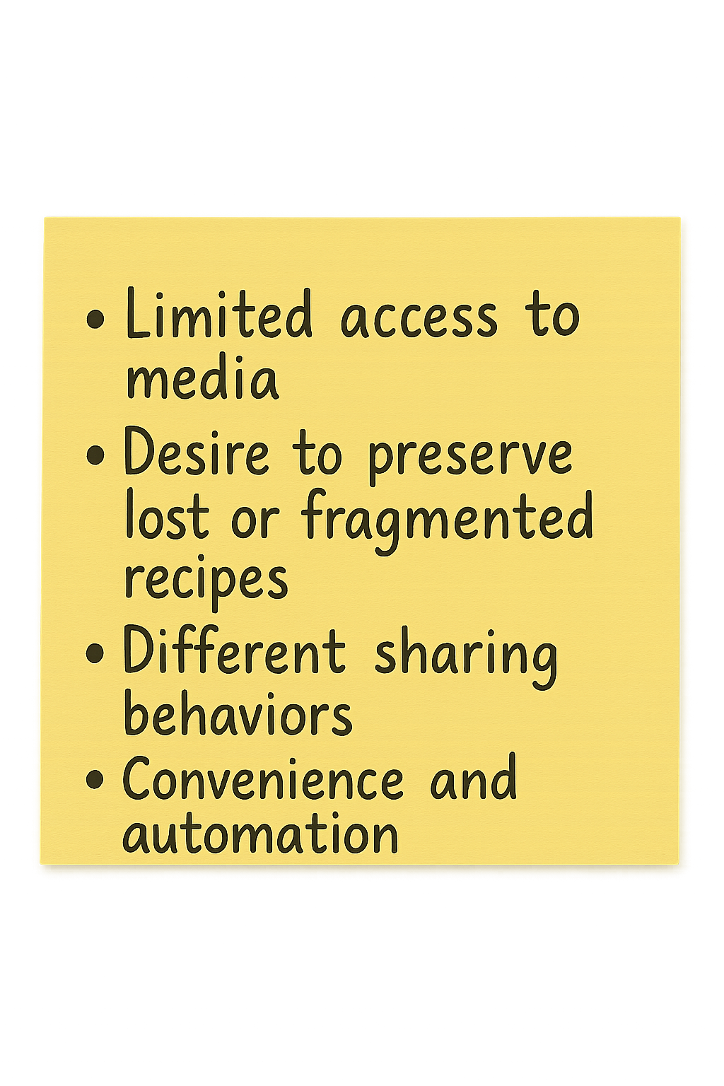 Limited access to media: Many didn’t have quick access to photos of their relatives, the dish, or the original handwritten recipe, which made them hesitant to share.