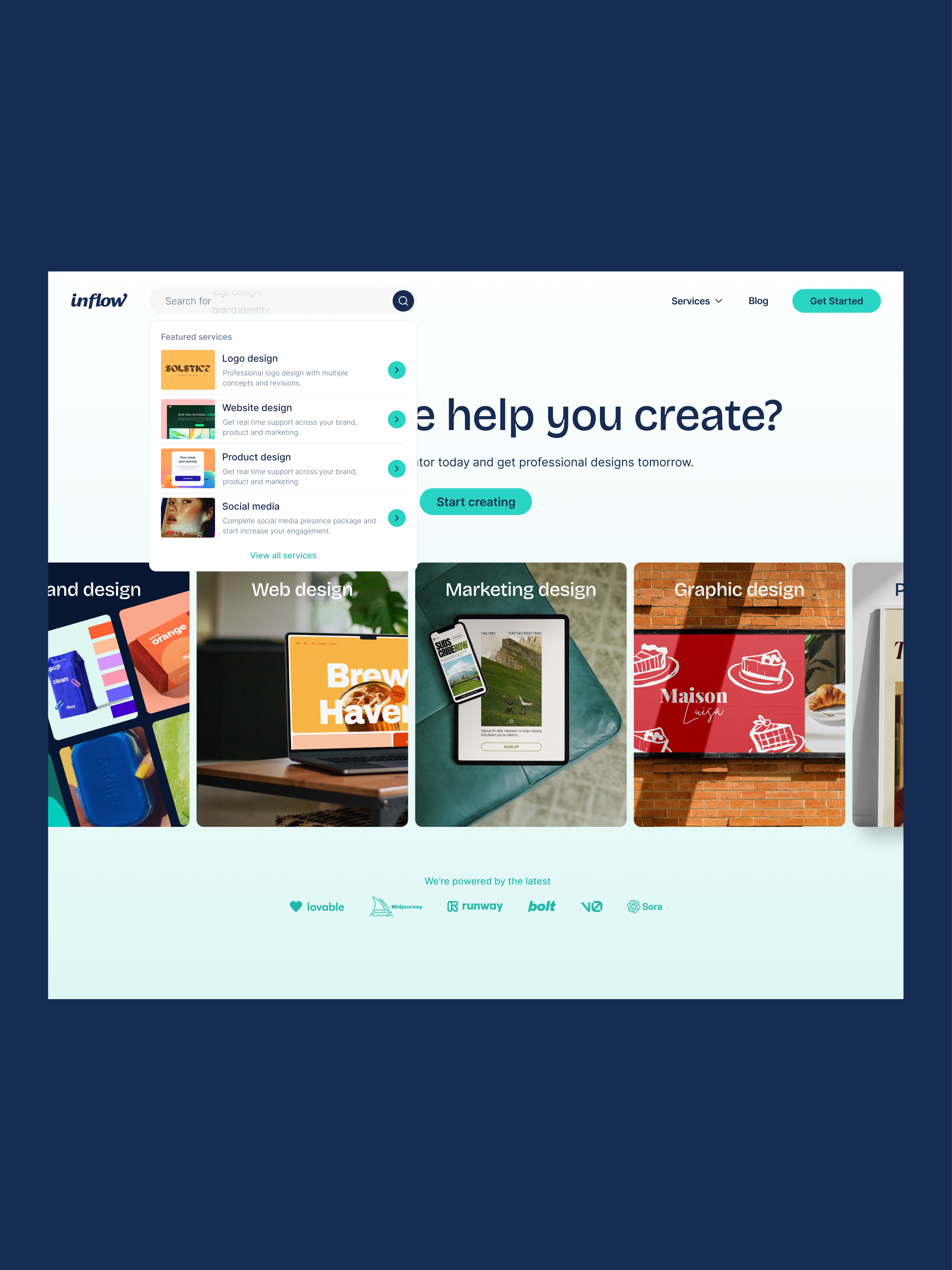 Whether you're looking for a complete brand identity, a sleek e-commerce website, a motion graphic for your latest ad, or a fully developed product design system, Inflow provides tailored solutions to help businesses at every stage. Each service is designed to offer flexibility, with options that scale based on complexity and budget, ensuring the best fit for startups, growing businesses, and established brands alike.